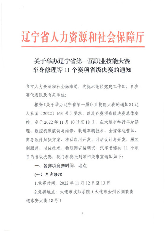 关于举办辽宁省第一届职业技能大赛车身修理等11个赛项省级决赛的通知