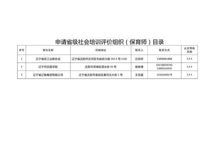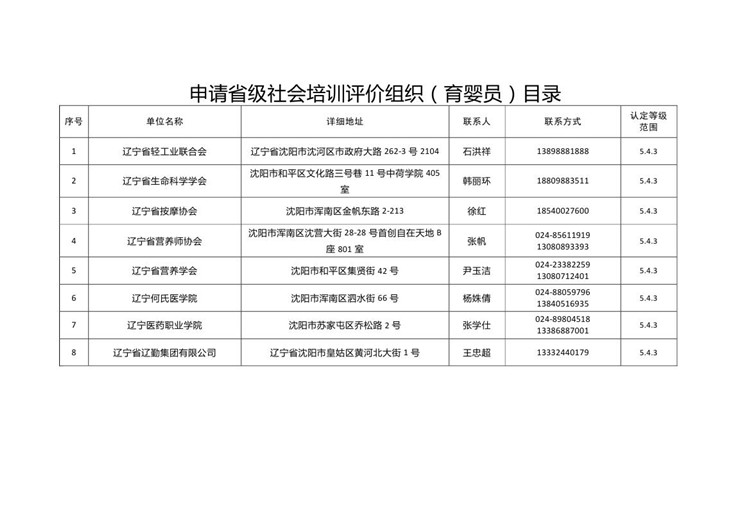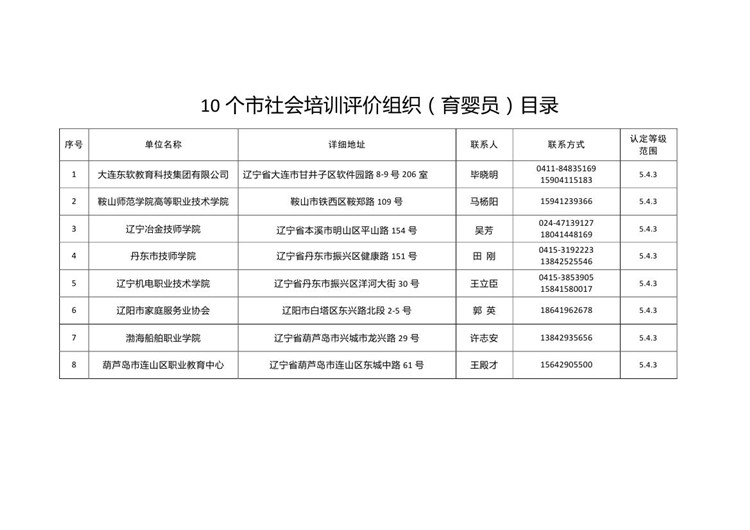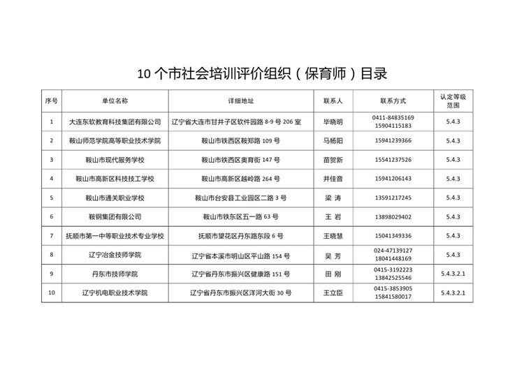 为贯彻落实党中央、国务院关于深化“放管服”改革,将技能人员水平评价由政府认定改为实行社会化认定的部署要求,我厅于2021年2月7日制定出台了《辽宁省社会培训评价组织职业技能等级认定工作规程(试行)》(辽51porn规〔2021〕1号),面向行业组织、院校、企业、社会培训机构征集遴选社会培训评价组织。对符合条件的单位,由我厅进行资质备案和赋码,并出具备案手续。截至目前,已有10个市(除锦州、阜新、朝阳、盘锦)60家社会培训评价组织取得职业技能等级认定资质,可按规定面向劳动者(含准备就业人员)开展职业技能水平考核评价。其中,可开展保育师职业技能等级认定的社会培训评价组织共15家;可开展育婴员职业技能等级认定的社会培训评价组织共8家(名单详见附表)。