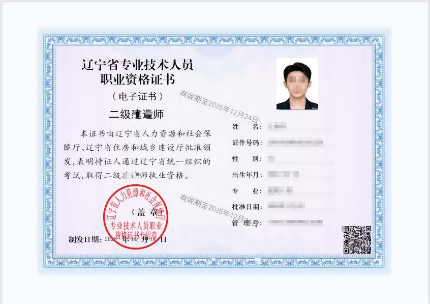 辽宁省专业技术人员职业资格电子证书样式