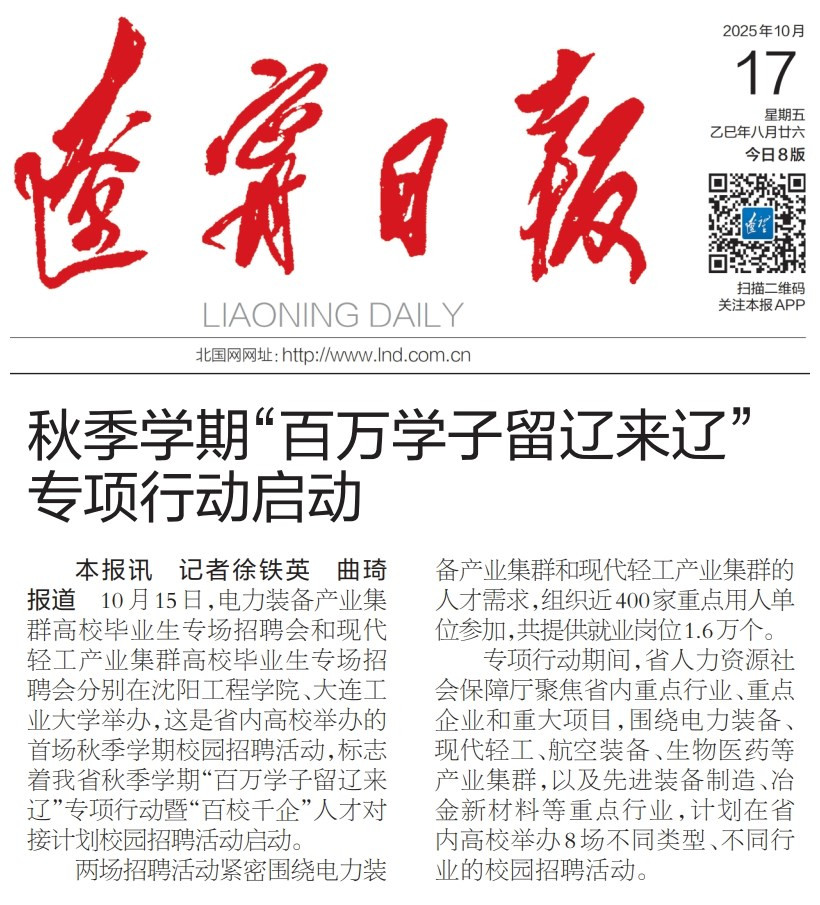 本报讯 记者徐铁英 曲琦报道 10月15日,电力装备产业集群高校毕业生专场招聘会和现代轻工产业集群高校毕业生专场招聘会分别在沈阳工程学院、大连工业大学举办,这是省内高校举办的首场秋季学期校园招聘活动,标志着我省秋季学期“百万学子留辽来辽”专项行动暨“百校千企”人才对接计划校园招聘活动启动。