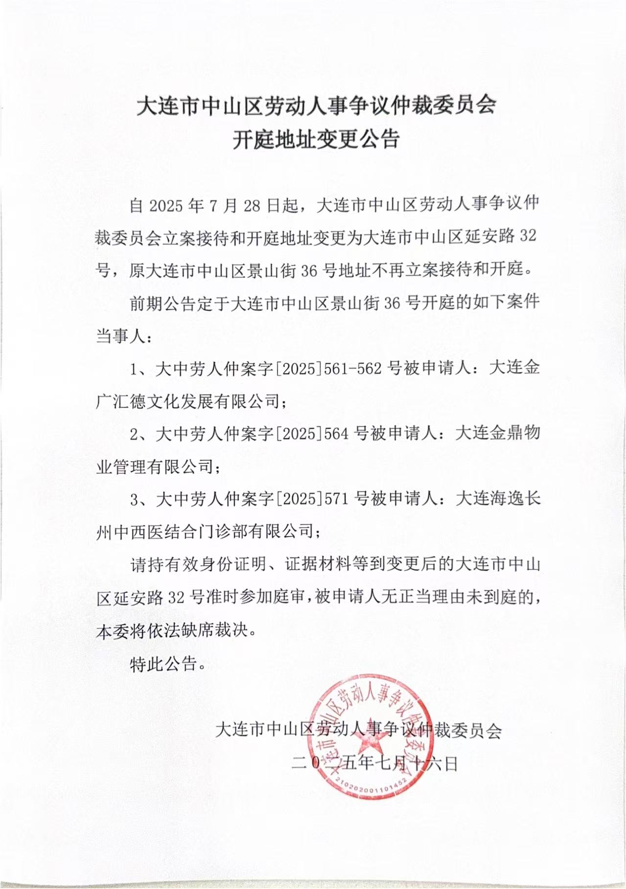 自2025年7月28日起,大连市中山区劳动人事争议仲裁委员会立案接待和开庭地址变更为大连市中山区延安路32号,原大连市中山区景山街36号地址不再立案接待和开庭。
