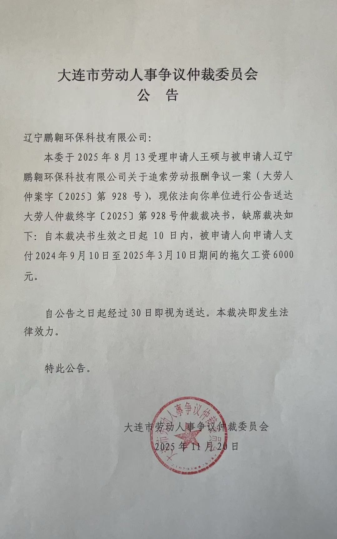 本委于2025年8月13受理申请人王硕与被申请人辽宁鹏翱环保科技有限公司关于追索劳动报酬争议一案(大劳人仲案字〔2025〕第928号),现依法向你单位进行公告送达大劳人仲裁终字〔2025〕第928号仲裁裁决书,缺席裁决如下: