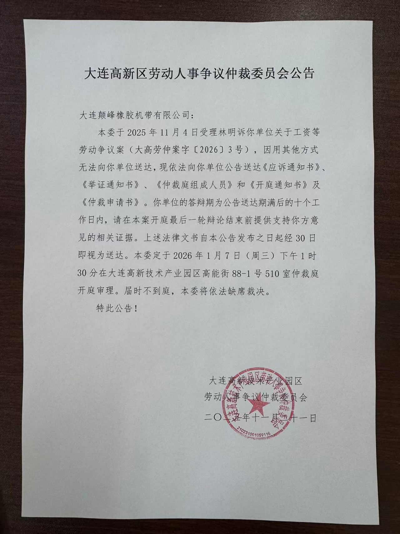 本委于2025年11月4日受理林明诉你单位关于工资等劳动争议案(大高劳仲案字〔2026〕3号),因用其他方式无法向你单位送达,现依法向你单位公告送达《应诉通知书》、《举证通知书》、《仲裁庭组成人员》和《开庭通知书》及《仲裁申请书》。你单位的答辩期为公告送达期满后的十个工作日内,请在本案开庭最后一轮辩论结束前提供支持你方意见的相关证据。上述法律文书自本公告发布之日起经30日即视为送达。本委定于2026年1月7日(周三)下午13时30分在大连高新技术产业园区高能街88-1号510室仲裁庭开庭审理。届时不到庭,本委将依法缺席裁决。